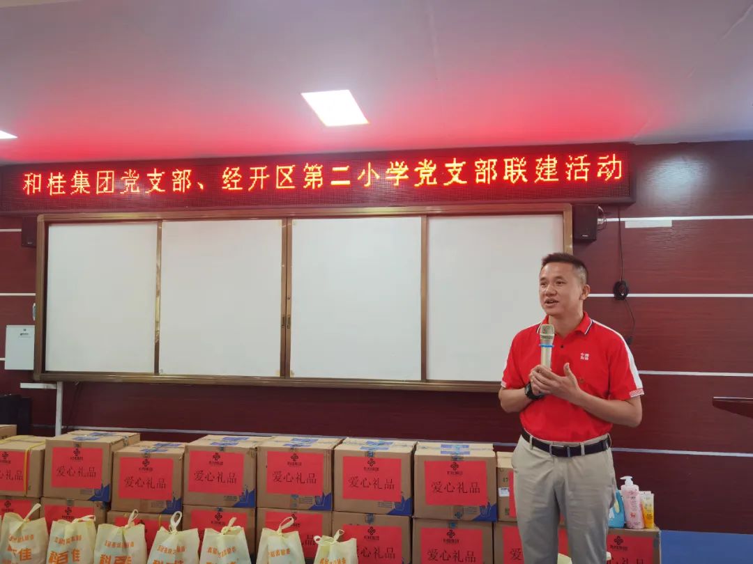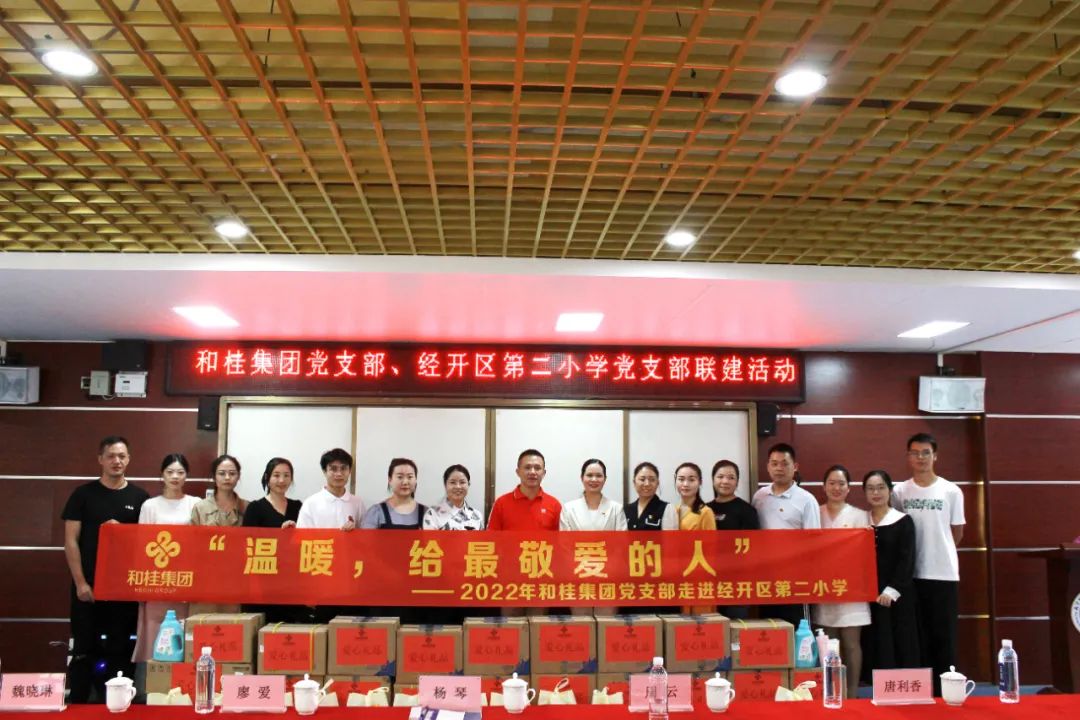 經(jīng)開區(qū)環(huán)衛(wèi)站慰問活動結(jié)束后,和桂集團(tuán)黨支部一行又來到經(jīng)開區(qū)第二小學(xué)開展慰問。經(jīng)開區(qū)第二小學(xué)黨支部書記、校長楊琴攜校方領(lǐng)導(dǎo)熱情接待。校方對和桂集團(tuán)開展的慰問工作表示感謝和高度贊揚,并代表學(xué)校領(lǐng)導(dǎo)班子向大家承諾:學(xué)校會盡心盡力辦好教育,為學(xué)生服務(wù),為社會服務(wù)。