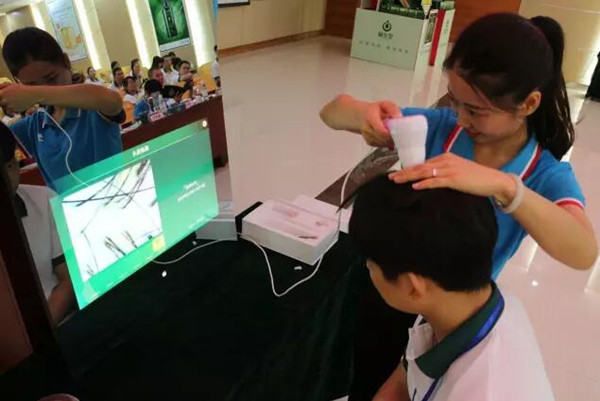 市場部總監(jiān)甘斌在會上向大家介紹了,源生堂獨家定制開發(fā)的4.0版本的頭皮智能檢測儀——“魔鏡”。他表示,“魔鏡的三大保障:魔鏡的智能化、專業(yè)化、多媒體功能給顧客帶來科學(xué)的檢測”。魔鏡從專業(yè)的角度,系統(tǒng)地將頭皮頭發(fā)的各種問題分類、分析,從整體到局部都能透徹地進行評估,從而有助養(yǎng)發(fā)顧問為顧客訂制最精確的護理方案。在眾多養(yǎng)發(fā)儀器中,頭皮檢測儀是最重要的儀器之一,它用來檢測頭發(fā)問題的根源,讓消費者清晰地看到自己頭發(fā)的養(yǎng)護前和養(yǎng)護后的對比照,及時了解頭皮健康狀況。