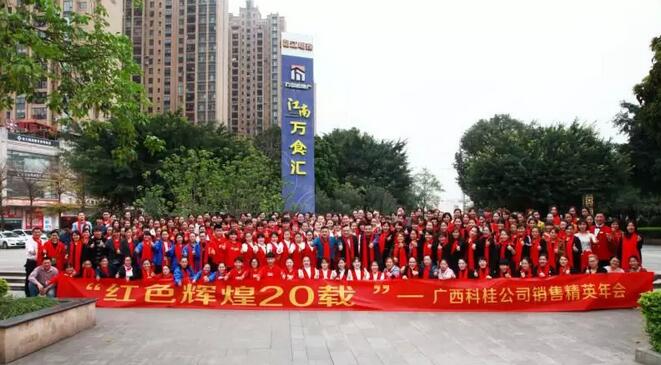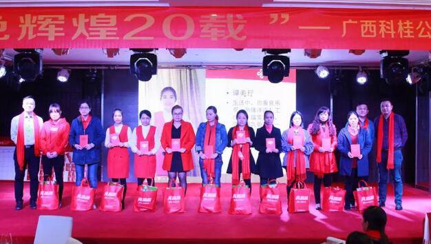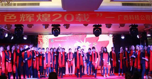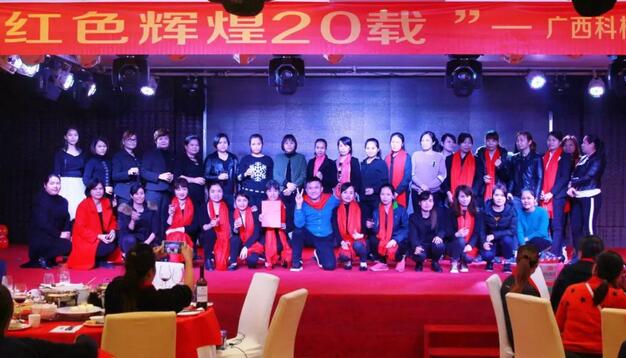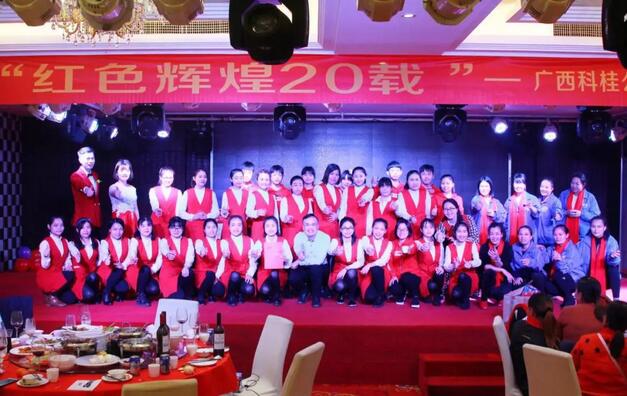 本次年會(huì)最大這點(diǎn)是主題以《紅色輝煌20年》講述的是廣西科桂貿(mào)易有限責(zé)任公司是在1998年的6月28日在南寧市桃源路上成立,到今年,剛好20年大慶。本次年會(huì)以紅色系為主,所有參會(huì)人員從穿衣到裝飾上都可謂是從頭火到腳,寓意我們生意紅紅火火,家庭美美滿滿。