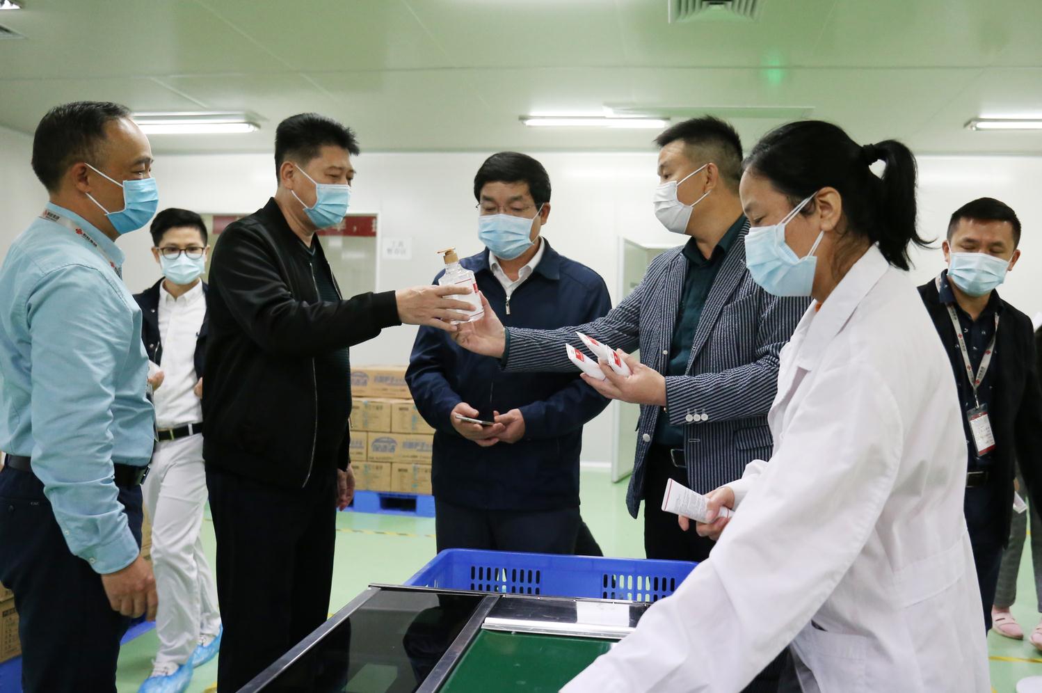 趙紅明部長一行在黃總的帶領(lǐng)下,分別走進(jìn)和桂集團(tuán)各分子公司辦公區(qū)、集團(tuán)展廳、生產(chǎn)車間等進(jìn)行調(diào)研。在生產(chǎn)車間,趙紅明部長向黃總詳細(xì)了解了企業(yè)殺菌消毒產(chǎn)品的生產(chǎn)情況。黃總介紹,和桂集團(tuán)作為國家高新技術(shù)企業(yè)、國家認(rèn)證的消毒產(chǎn)品生產(chǎn)企業(yè)、廣西抗疫骨干企業(yè),在疫情不斷蔓延的形勢下,公司克服人力與物資不足等困難,積極投入防疫應(yīng)急用品的生產(chǎn)中,推出了免洗手消毒凝膠、抑菌護(hù)手洗手液、除菌洗衣液六款殺菌消毒產(chǎn)品,得到消費(fèi)者的好評,供不應(yīng)求。在抗疫物資緊缺的情況下,公司急一線所急,將生產(chǎn)的產(chǎn)品優(yōu)先捐贈給南寧市第二人民醫(yī)院等抗疫一線,緩解抗疫一線所需。