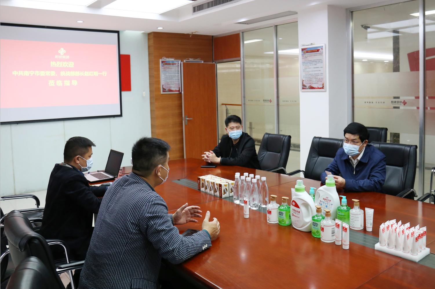 2月28日,中共南寧市委常委、統(tǒng)戰(zhàn)部部長趙紅明率隊(duì),在南寧市委統(tǒng)戰(zhàn)部副部長、市工商聯(lián)黨組書記李忠南的陪同下,蒞臨和桂集團(tuán)開展疫情防控和復(fù)工復(fù)產(chǎn)調(diào)研工作,并贈送復(fù)工口罩。受到和桂集團(tuán)總裁黃偉文的熱情接待,雙方就疫情防控和復(fù)工復(fù)產(chǎn)等事宜舉行會談,并達(dá)成一致意見。