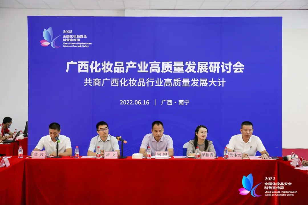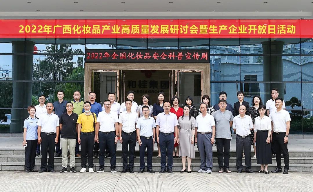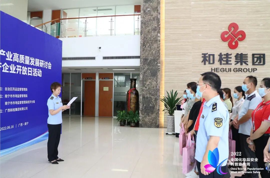 6月16日,廣西化妝品高質(zhì)量發(fā)展研討會暨生產(chǎn)企業(yè)開放日在和桂集團舉行,作為2022年全國化妝品安全科普宣傳周廣西系列活動之一,政府高度重視,社會廣泛關注。自治區(qū)藥品監(jiān)督管理局化妝品監(jiān)管處副處長唐文,南寧市市場監(jiān)督管理局黨組成員、副局長宋剛,自治區(qū)藥品監(jiān)管局南寧檢查分局局長梁柳青,廣西化妝品協(xié)會會長、廣西和桂集團有限公司董事長黃偉文出席會議,行業(yè)專家學者、企業(yè)負責人、媒體單位,通過政府平臺公開征集的近30位公眾代表參加活動。研討會由南寧市市場監(jiān)督管理局經(jīng)開分局局長金濤主持。